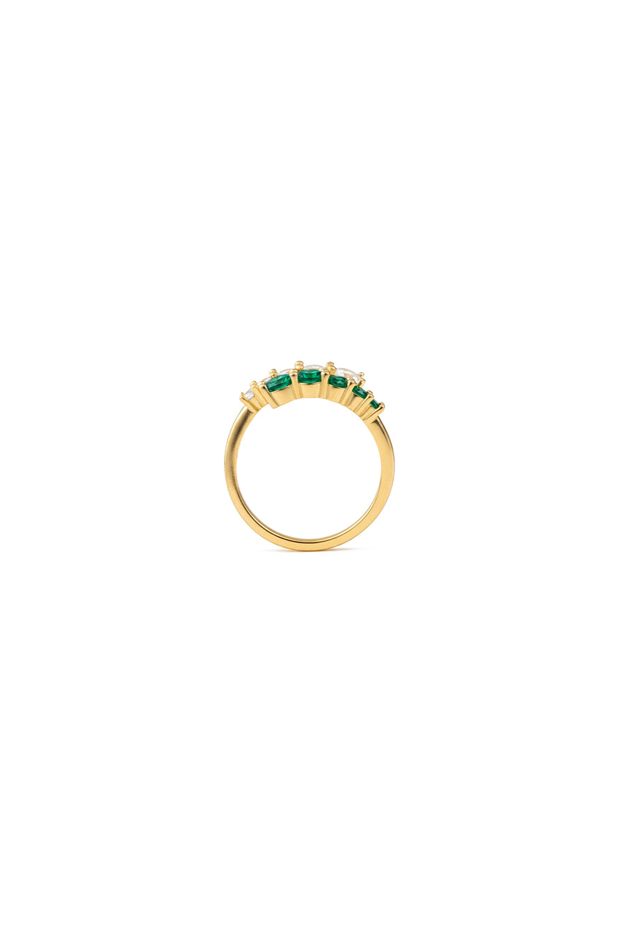 The upper row is adorned with sparkling white stones, while the lower row adds contrast through a choice of white or green stones, giving the ring a distinctive yet elegant character. This layered composition creates a sense of depth and movement, allowing the light to reflect beautifully from every angle.