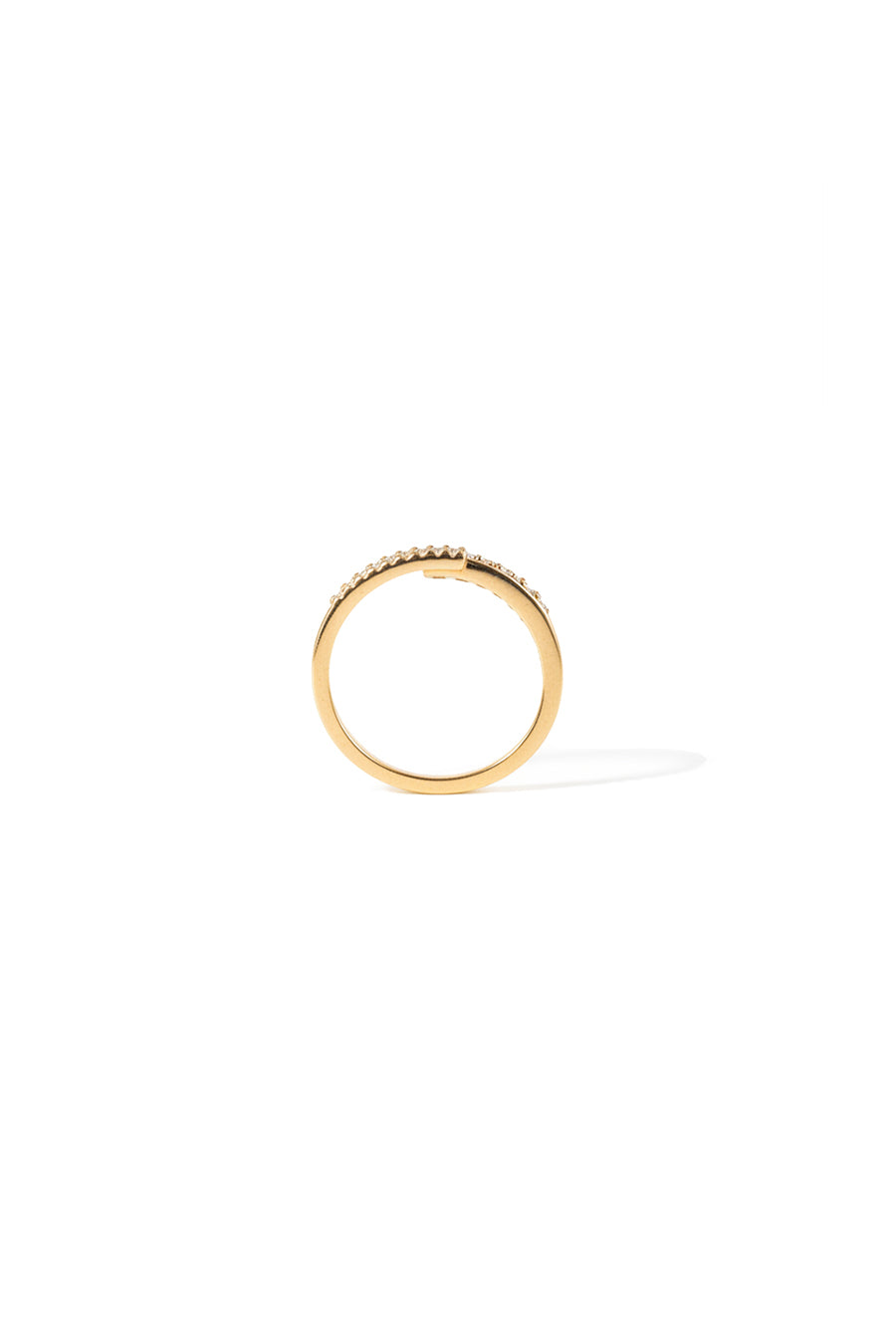 Its open design features two elegant ends that meet in perfect balance — one adorned with a rectangular row of sparkling stones that adds structure and character, while the other forms a delicate curved band set with tiny shimmering pavé stones that gently reflect the light.